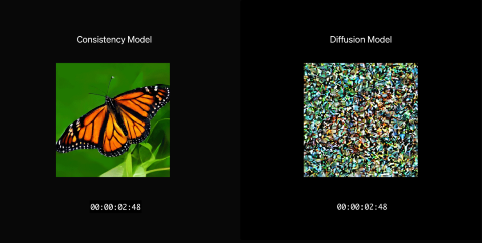 图 | 在单个 A100 GPU 上采样 2 秒,sCM 模型已经十分清晰,扩散模型还是一片模糊(来源:OpenAI)