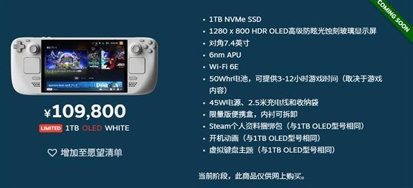 白色限量版在配置与参数方面与OLED 1TB版本完全一致,仅机身与操控原件变为白/灰配色,且附送独家白色收纳盒与白色微纤擦拭布,定价679美元,收货地址位于日本、韩国、港台地区的顾客可通过Komodo下单配送。